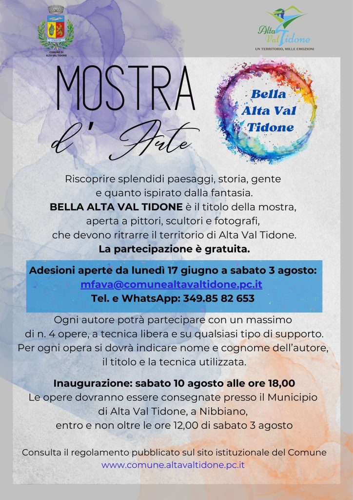 I soggetti ritratti devono rappresentare il territorio di Alta Val Tidone. Gli artisti possono comunicare la loro adesione scrivendo al Comune di Alta Val Tidone a mfava@comunealtavaltidone.pc.it o tramite Tel. e WhatsApp: 349.858.2653. All’adesione si possono allegare la fotografie delle opere. Ogni autore potrà partecipare con un massimo di n. 4 opere, in formato non oltre la misura 70×100 cm. Per ogni opera, si dovrà indicare nome e cognome dell’autore, il titolo e la tecnica utilizzata. Le opere presentate possono essere eseguite con qualsiasi tecnica e su qualsiasi tipo di supporto. La consegna delle opere avrà luogo presso il Municipio di Alta Val Tidone entro e non oltre sabato 3 agosto. Tutti i lavori saranno riconsegnati agli autori nei giorni seguenti alla chiusura della mostra.